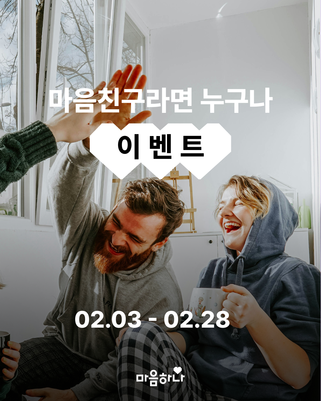 [2월 Event] 마음친구라면 누구나2월에 만난 마음하나, 환영해요! Event 1. 신규 회원 가입 이벤트 EVENT 2. 친구 추천 이벤트 EVENT 3 마음톡 댓글 이벤트