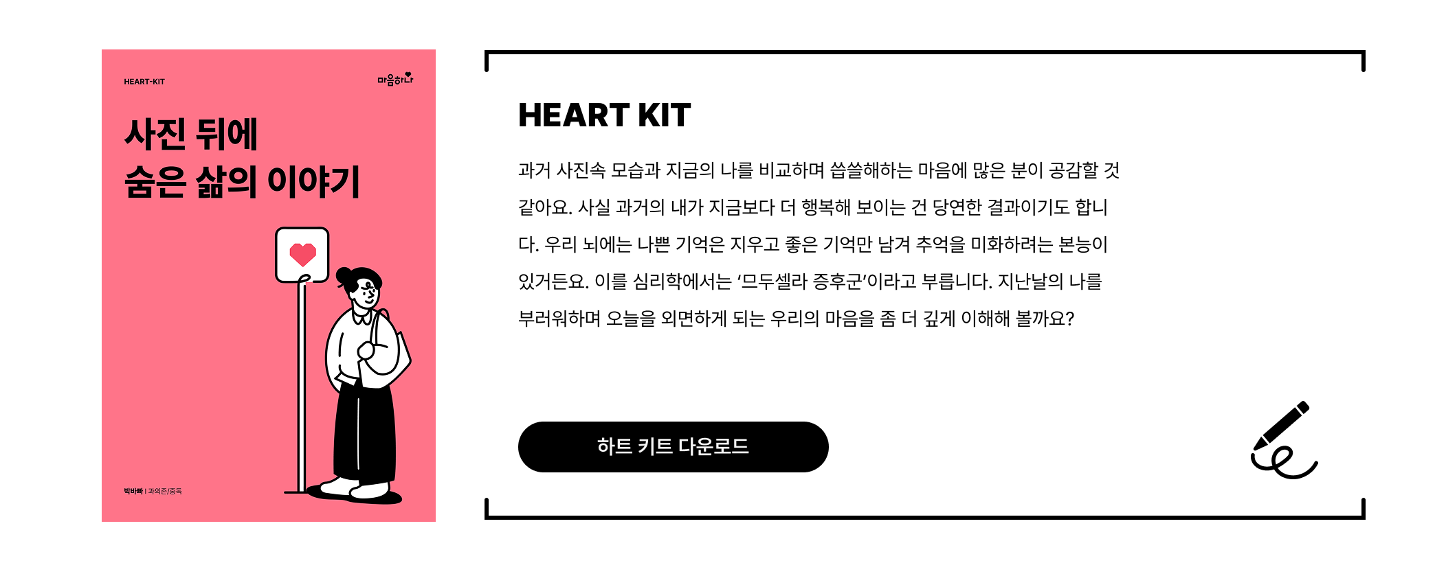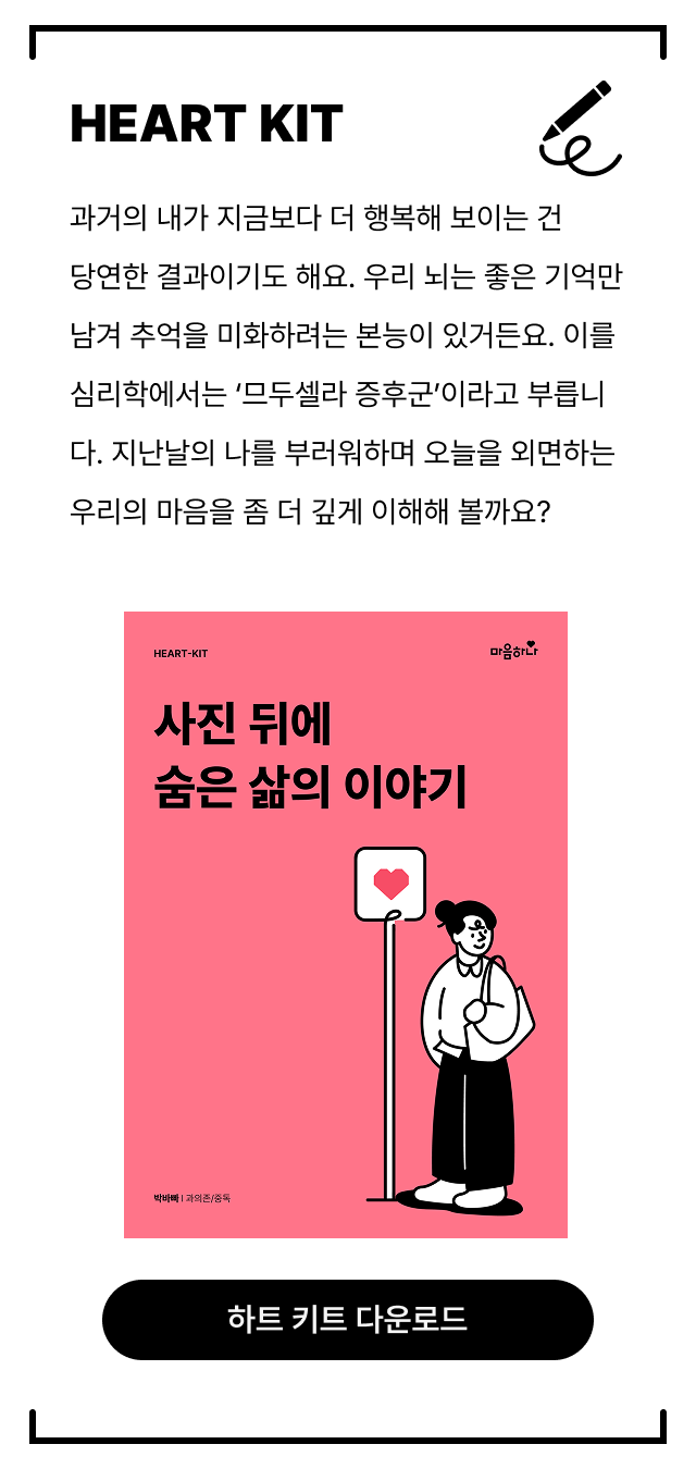오늘은 잠시 사진첩을 덮고, 지금의 나를 바라봐주세요. 사진 속 나는 이미 완성되어 멈춰있는 과거이지만, 오늘의 나는 생생하게 움직이며 삶을 만들어 가는 중입니다. 오늘 배운 내용을 혼자서도 연습할 수 있도록 ‘하트키트(HEART-KIT)’를 준비했어요. 하트키트를 통해 과거에 머물던 시선을 조금씩 현재로 옮겨올 수 있기를 바랍니다. |